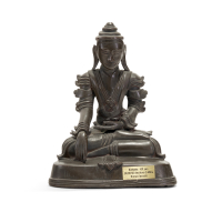 Bronzo, la divinità seduta a gambe incrociate su fiore di loto, la mano destra a toccare terra nel gesto della rassicurazione.