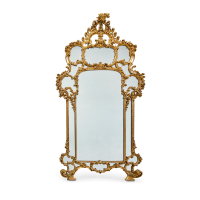 Legno intagliato e dorato, sagomata, riccamente decorata con volute fogliacee e rocailles, a doppia cornice, su piedi a ricciolo e sormontata da alta cimasa aggettante.