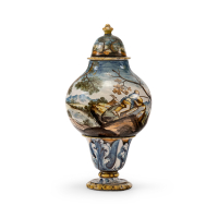 Maiolica, decorata a 'gran fuoco' con paesaggio e piccoli personaggi.
