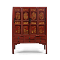 Legno laccato e dorato, la parte superiore con quattro ante ornate con composizioni con figure entro riquadri, sei cassetti nella zona inferiore, accessori in metallo.