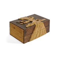 Legno intagliato e accessori in metallo, tre sezioni sovrapposte, il davanti delle sezioni superiore e inferiore con motivi floreali, il davanti della sezione centrale con quattro composizioni con figure nel paesaggio entro formelle quadrate.