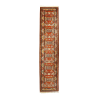 Decoro policromo con motivi geometrici su fondo arancione e beige.