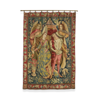 Raffigurante scena galante con coppia di giovani sotto baldacchino sorretta da angeli, entro ricca bordura a motivi vegetali.
