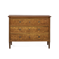 Noce intarsiato, a tre cassetti sul fronte con decoro a motivi geometrici e festoni stilizzati, su piedi rastremati.