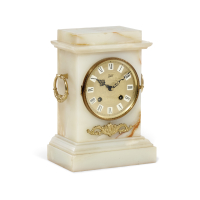 Cassa architettonica in alabastro con manici e applicazioni in metallo dorato. Quadrante circolare in metallo dorato con numeri romani entro finte cartouches, meccanica a bilanciere a otto giorni di carica, suoneria delle ore e dei quarti al passaggio.