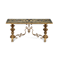 Piano in lavagna dipinto a volute floreali, con putti e farfalle, uno stemma sul fronte, montato su base in legno dorato con gambe a balaustro unite da una traversa in ferro battuto dorato.