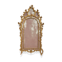 Legno intagliato e dorato, a doppia cornice, con ricco decoro di volute e rocailles, fermagli floreali e cimasa tripartita.