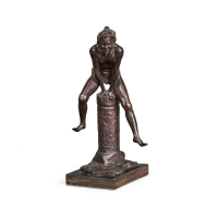 Base circolare su quattro piedi geometrici, fusto in forma di figura femminile che regge un vaso, coppa circolare con prese a girale con fiori.