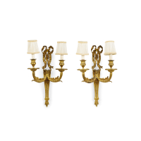 Metallo dorato, a due luci, con decori geometrici, cimate da ricco motivo a nastri.