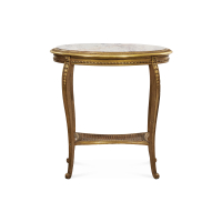 Legno intagliato e dorato con decori di motivi fogliacei e fermagli floreali, tripode, le gambe arcuate unite da ripiano in paglia, piano in marmo bianco con venature policrome.