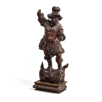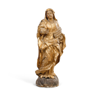 Legno intagliato, parzialmente laccato e dorato e terracotta dipinta.