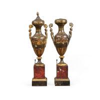 Legno e papier-mâché laccato e dorato, il corpo ovoidale decorato a motivi floreali e fregi dorati, prese figurate con cariatidi, su basi quadrangolari dipinte a finto marmo.
