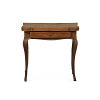 Noce lastronato e intarsiato in essenze varie e osso, piano sagomato apribile a libro con motivi decorativi al centro, un cassetto nella fascia.