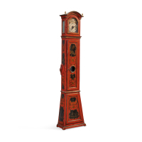 Cassa in legno laccato rosso, dipinto e parzialmente dorato con riserve e cartouches.