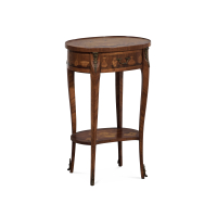 Noce lastronato e intarsiato, piano circolare, un cassetto e ripiano inferiore, applicazioni in bronzo.