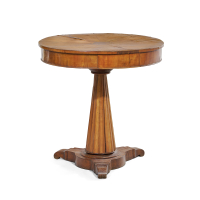 Lastronato in noce con intarsi, tripode con base sagomata, il fusto a cono rastremato e scanalato.