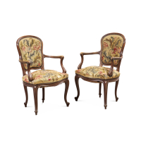 Mogano, sagomate, con gambe e braccioli mossi, rivestimento in tessuto floreale a fondo chiaro. Il lotto include due poltrone e due sedie.