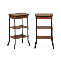 Legno di rosa intarsiato in essenze varie con decori a nastri e motivi geometrici, a tre piani, un cassetto sulla fascia, con ringhiere a giorno in ottone, su gambe ebanizzate.