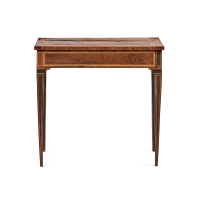 Noce, intarsiato a filetti in essenze varie, rettangolare, su gambe rastremate.