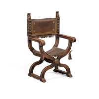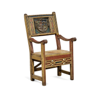Legno intagliato e dipinto, uno stemma al centro dello schienale, con braccioli ad ansa.