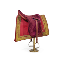 Sella in cuoio e velluto rosso operato con sottosella in panno rosso e passamaneria dorata, staffe in cuoio e metallo e piedestallo in ottone.