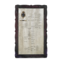 Grande placca rettangolare in metallo argentato con genealogia incisa, con stemma e motto in argento e argento dorato applicati, entro cornice sagomata in legno e velluto viola.