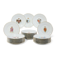 Gruppo di trentuno piatti in porcellana bianca con bordo dorato, al centro emblemi dei reggimenti