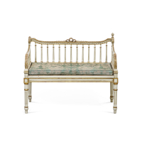 Legno laccato e parzialmente dorato, con schienale traforato e braccioli a ricciolo, rivestimento in tessuto damascato.