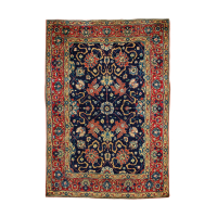 Decoro policromo a motivi floreali su fondo borgogna e blu scuro.