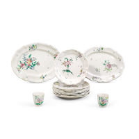 Maiolica policroma decorata a gran fuoco con mazzi di fiori all'europea, il lotto si compone di otto piatti, due vassoi e due chicchere.