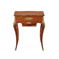 Legno di rosa intarsiato in legno ebanizzato ed essenze varie, il piano e il fronte del cassetto impiallacciati a marqueterie, applicazioni in bronzo dorato, il piano sagomato e apribile con specchio all'interno, un cassetto sul fronte, su gambe mosse leggermente