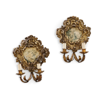Legno intagliato e dorato, a due luci, bracci in tolla dipinta con decoro fitomorfo.