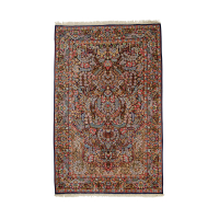 Decoro policromo a motivi floreali su fondo blu, rosso, avorio e verde.