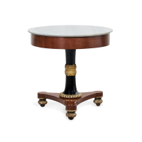 Noce, legno parzialmente ebanizzato, intagliato e dorato, il piano circolare in marmo bianco, su base tripode con piedi torniti.