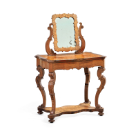 Noce, con piano rettangolare, su gambe sagomate e mosse, unite da traverse intagliate.