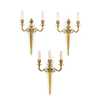Bronzo dorato, a tre luci con bracci mossi e fusto rastremato, cimate da una pigna.