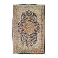 Decoro policromo a motivi floreali su fondo blu, beige e ruggine.