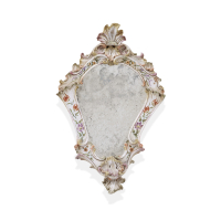 Terraglia dipinta a fiori, sagomata, la cimasa sormontata da una conchiglia, lo specchio coevo, su modello antico, marcata alla base.