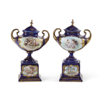 Porcellana blu cobalto con decoro policromo in decalcomania.