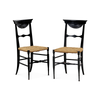 Legno ebanizzato, schienale con motivo a ventaglio e seduta in paglia intrecciata.