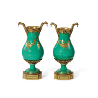Porcellana smaltata e decorata in oro, montata in bronzo dorato, a balaustro con prese in forma di uccello.