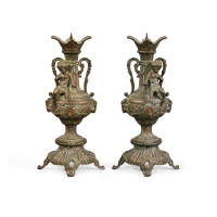 Bronzo, in forma di vaso con doppie prese ad ansa, il corpo ornato da figure di putti a tutto tondo, su basi sagomate.