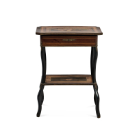 Legno intarsiato in essenze varie parzialmente tinto ed ebanizzato, piano apribile rettangolare decorato a motivi floreali, all'interno uno specchio e ripiano inferiore, applicazioni in bronzo dorato.