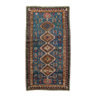 Decoro policromo a motivi geometrici su fondo blu e verde.