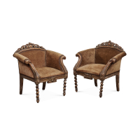 Noce intagliato, con schienale arcuato sormontato da ricca cimasa traforata a motivi floreali e volute, braccioli a ricciolo, le gambe anteriori tornite a spirale, rivestimento in velluto terra di Siena.