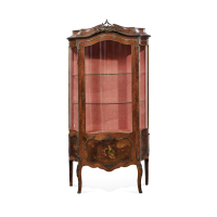 Essenze varie, sagomata, con un’anta e laterali in vetro, a due ripiani in vetro, l'interno rivestito in tessuto rosso, con applicazioni in bronzo e riserve dipinte con scene galanti e paesaggi, su gambe mosse.