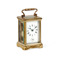 Cassa in ottone dorato e pannelli in vetro. Quadrante in smalto bianco con numeri romani, meccanica con scappamento a cilindro, funzione sveglia.