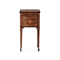 Noce, impiallacciato e intarsiato in essenze varie, uno sportello e un piccolo ripiano estraibile sul fronte.