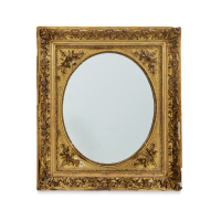 Legno intagliato e dorato, riccamente decorato con motivi vegetali, volute e racemi intrecciati con elementi fogliacei e floreali, lo specchio ovale non coevo.