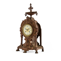 Antimonio patinato, cassa in metallo sagomata poggiante su piedini zoomorfi e mascherone centrale. Quadrante in smalto bianco con decorazione centrale in metallo sbalzato, movimento con scappamento ad ancora, sospensione a lamella, suoneria delle ore e mezze ore al
